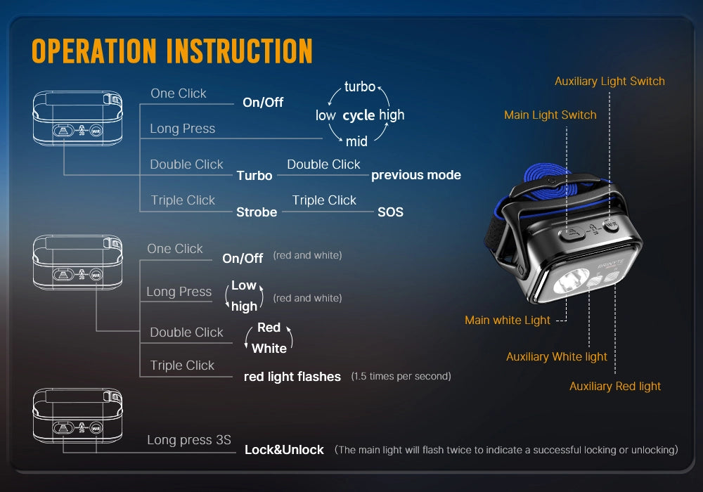 Brinyte HC01 has three light sources; one main white light, two auxiliary light (red and white). Specially designed for use in activities in frigid zone, industrial maintenance, production operation and various sports such as trail running, trekking, camping, mountaineering, rock climbing, cycling, etc.